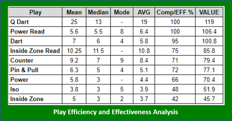 Every postseason, I evaluate how many times we called a play, the mean, median, and mode of yards gained per play, and the efficiency of each play. Efficiency is determined by the play earning 4+ yards, a first down, or a touchdown. That determines the relative benefit of a play. The cost is determined by how much time it takes to install or teach the play in meetings and how much time is allotted in practice to work on the techniques and schemes associated with a particular play. Simply stated, plays that do not yield high averages, efficiencies, or touchdowns are not worth investing time in (particularly if the play is “expensive” costing us a great deal of coaching time.)