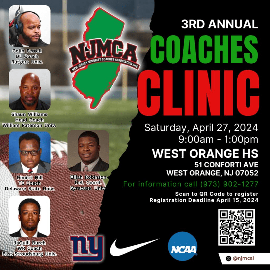 Coach Grant who is a Trustee of the New Jersey Minority Coaches Association will be promoting our clinic date at the NJMCA 3rd Annual Coaches Clinic he is hosting this Saturday 27 April from 9am-1pm on the campus of West Orange HS. To show my appreciation for all the good work Coach Grant does, a percentage of every player’s registration fee at our 19 May clinic will be donated to the NJMCA. More on the NJMCA Clinic here: